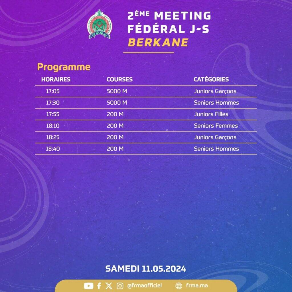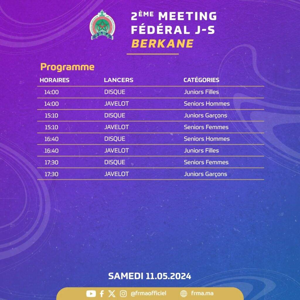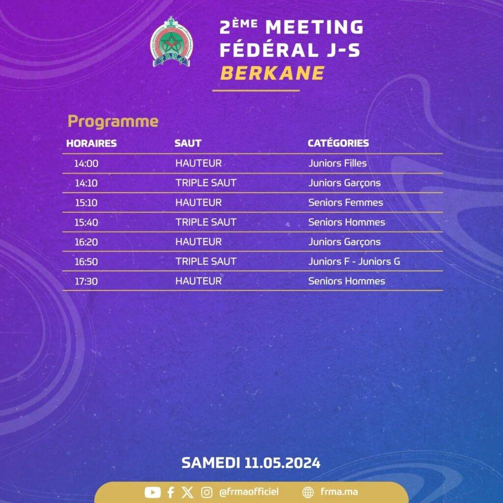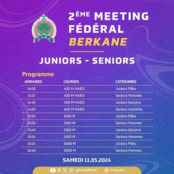 يستضيف مدينة بركان، يوم السبت 11 ماي 2024، الملتقى الفدرالي الثاني لألعاب القوى. هذا الحدث، الذي تنظمه الجامعة الملكية المغربية لألعاب القوى بالتعاون مع عصبة الشرق لألعاب القوى، سيجمع الشباب والكبار، الذكور والإناث، في منافسات مثيرة تبدأ من الساعة الثانية بعد الظهر. ستكون حلبة ألعاب القوى مكانًا للتحدي والتنافس، حيث يتواجه أفضل الرياضيين في البلاد. إنها فرصة رائعة للرياضيين لإظهار مهاراتهم والتنافس على أعلى مستوى.
