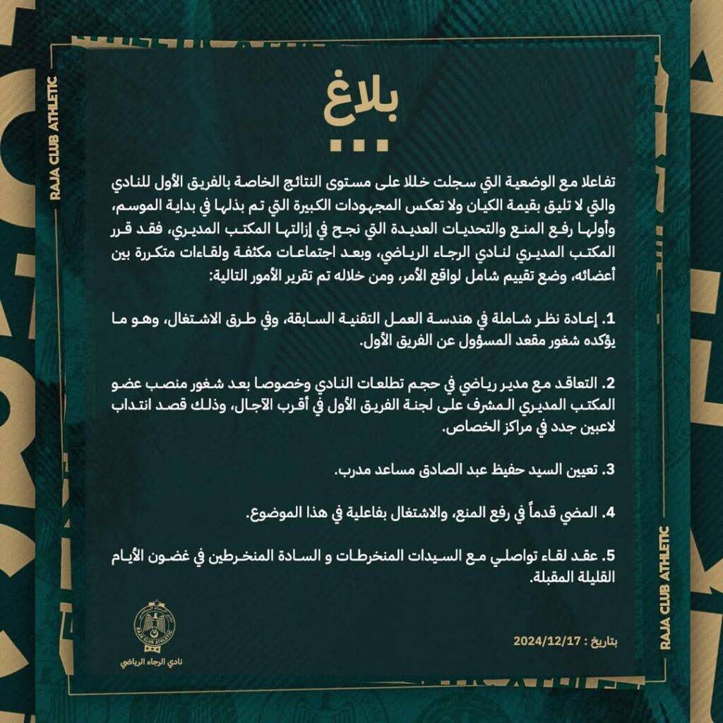 يأتي هذا البلاغ بعد سلسلة من النتائج غير المرضية التي أثرت على صورة النادي الذي يتمتع بتاريخ حافل بالألقاب، إذ يسعى المكتب المديري لإعادة الفريق إلى سكة الانتصارات وضمان التنافسية على مختلف البطولات.