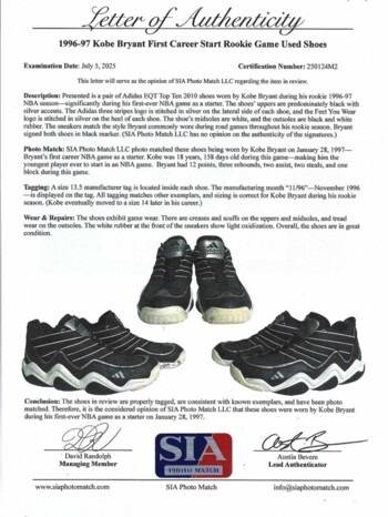 الحذاء، من طراز Adidas EQT Top 10، يحمل توقيع براينت على كل فردة، مع شهادات مصادقة رسمية صادرة عن مؤسسة “PSA/DNA”، الذراع التوثيقي لشركة Professional Sports Authenticator.