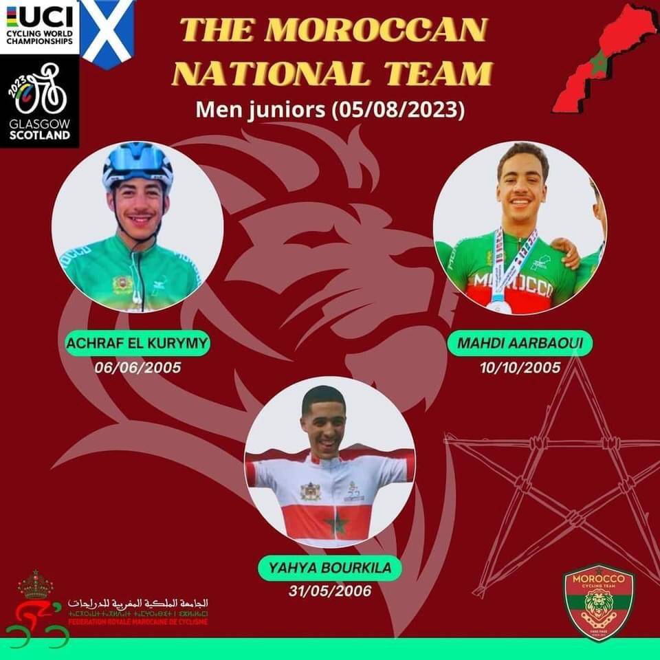 كما يتشكل المنتخب، ضمن نفس الصنف،من بطلي المغرب في السباق على الطريق وضد الساعة في فئة الشبان، أشرف الكريمي والمهدي العرباوي بالإضافة إلى يحيى بوركيلة.