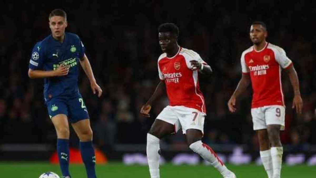 إفتتح ارسنال التسجيل في الدقيقة 8 عبر بوكايو ساكا بعد ان تصدى حارس آيندهوفن لتسديدة من مارتن اوديغارد التي عادت صوب ساكا وادخلها المرمى. ووسّع ارسنال النتيجة في الدقيقة 20 عبر ليونارد تروسارد من خلال هجمة مرتدة حيث وصلته تمريرة حاسمة من ساكا. اما الهدف الثالث فلقد جاء من خلال غابرييل جيسوس في الدقيقة 38 بعد ان وصلته تمريرة حاسمة من تروسارد مسددًا الكرة بقوة في المرمى. ولقد إنتهى الشوط الأول بتقدم ارسنال بنتيجة 3-0.