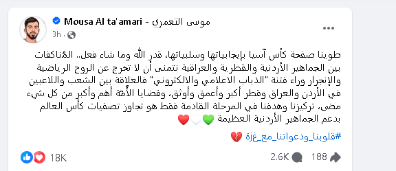 وجاء في تدوينته: “لقد انتهت رحلتنا في كأس آسيا، ونحن الآن ننظر إلى المستقبل بإيجابية. نأمل أن لا تنحرف المناقشات والمناوشات بين الجماهير الأردنية والقطرية والعراقية عن روح الرياضة. إن العلاقات بين شعوبنا تتعدى الرياضة، ولدينا قضايا وطنية أهم بكثير من ذلك”.