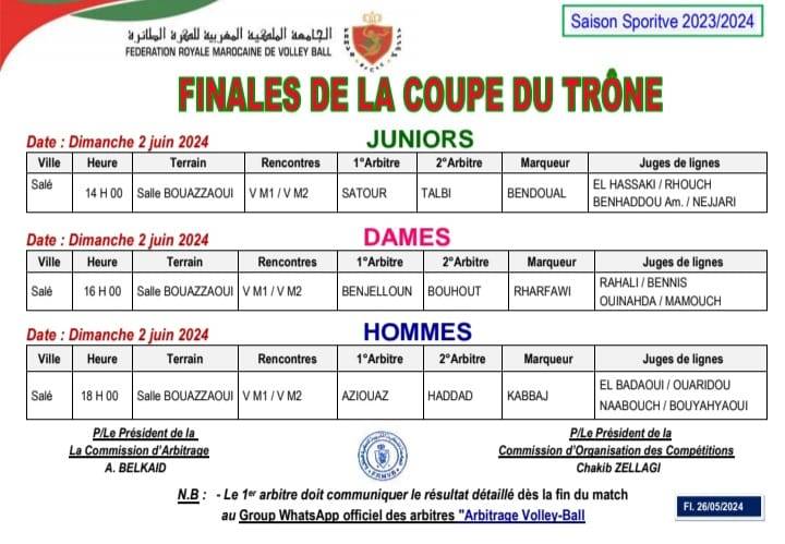 وحسب برنامج الجامعة الملكية المغربية للكرة الطائرة، ستقام مباراة نهائي كأس العرش (شبان) غدا الأحد على الساعة الثانية بعد الظهر في القاعة المغطاة البوعزاوي بمدينة سلا.